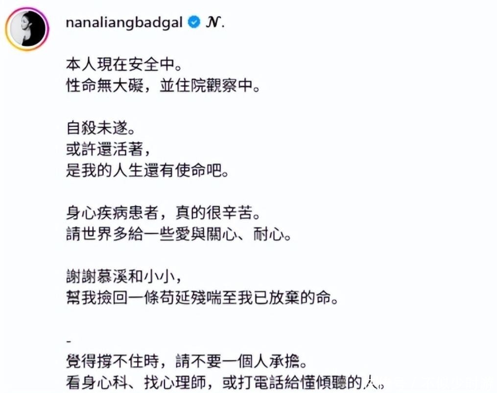 在身体状况稍有好转后,她在社交媒体发布动态报平安,并坦承确有自杀行为,同时上传了一张手腕处包扎的照片,似在回应外界对她真实处境的猜测。