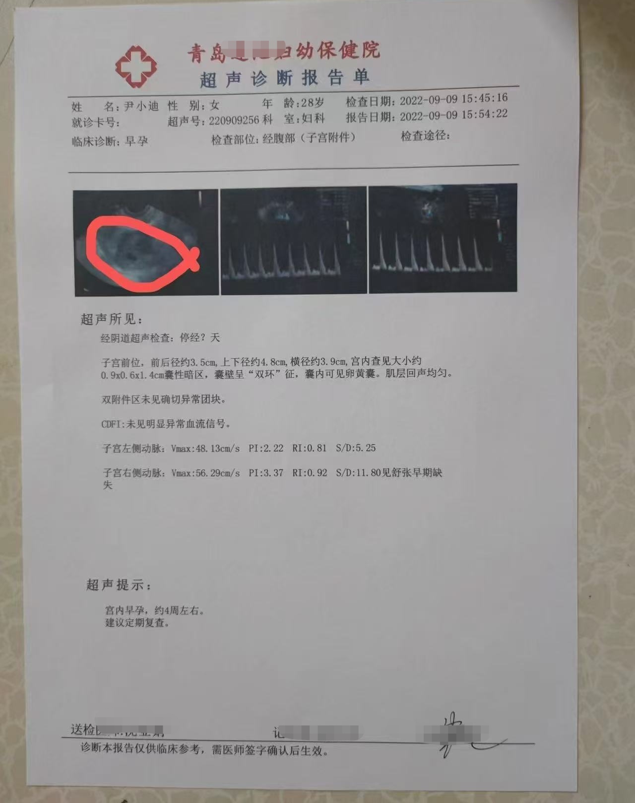 尹某某提供的虚假B超单(受访者供图)