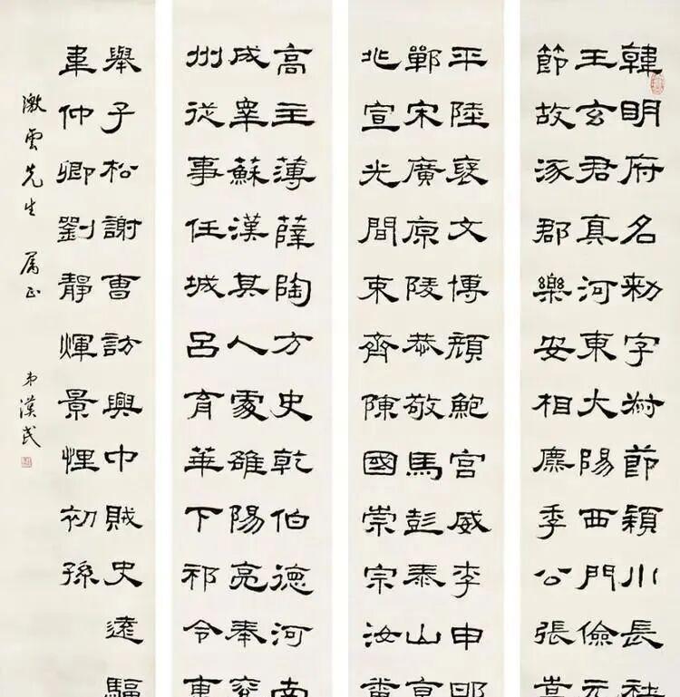 而且,他的隶书字形特别方正,这种方正感是其他书法家的隶书所没有的。他的字看起来就像一个个方方正正的小盒子,规规矩矩,却又不失灵动。这种独特的风格,让人看了大开眼界,也让人由衷地佩服他的用心和技艺。
