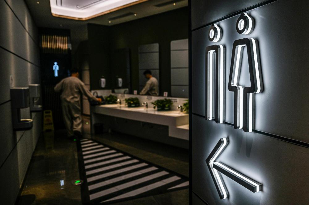 10月19日,在重庆市两江新区一商场,顾客如厕前观察卫生间标识。